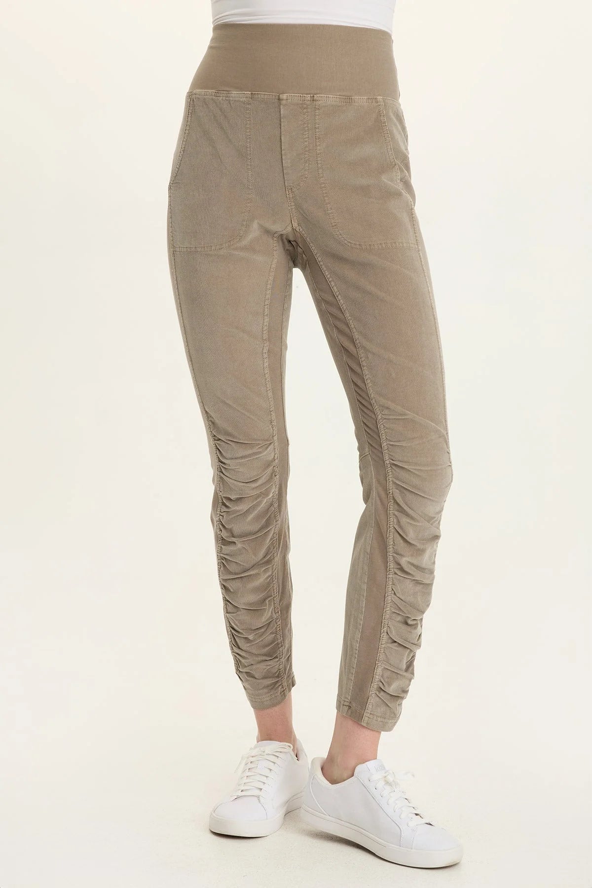 High-waisted legging, ruched leg panels, front pockets, jersey inserts from hip to hem and in cozy stretch corduroy to boot! Penny Legging just got an upgrade!