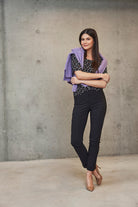 Pair with anything; the plain color means there are no limits with styling. The fabric is smooth and stretching bengaline,
