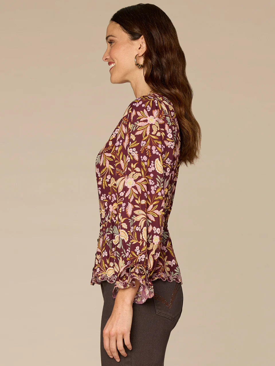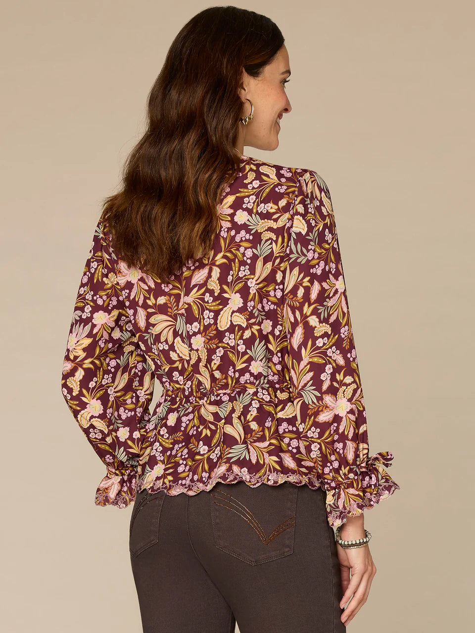 Long Tie Sleeve V-Neck Printed Woven Top with Scallop Edge Embroidery