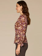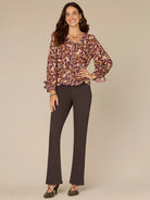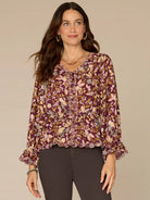 This everyday woven top features long sleeves with ties, a V-neck, scallop edge embroidery, and a peplum hem. Plus, its abstract floral print in neutral-pink shades make it effortless to pair with all your wardrobe favorites.