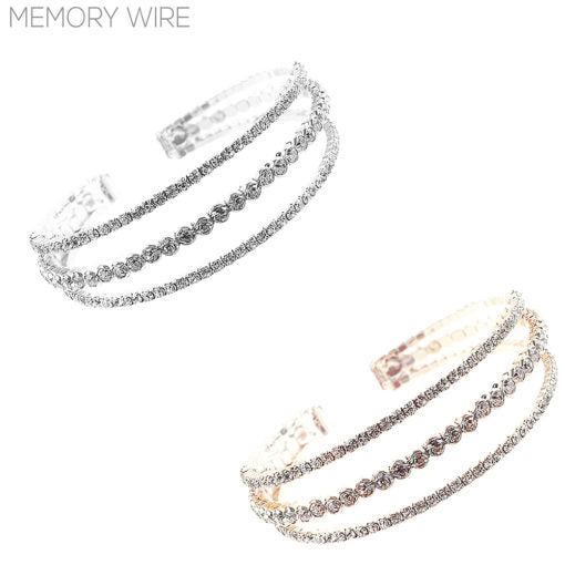 3 ROW CRYSTAL OPEN CUFF MEMORY WIRE BRACELET. SILVER, GOLD