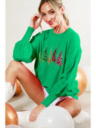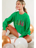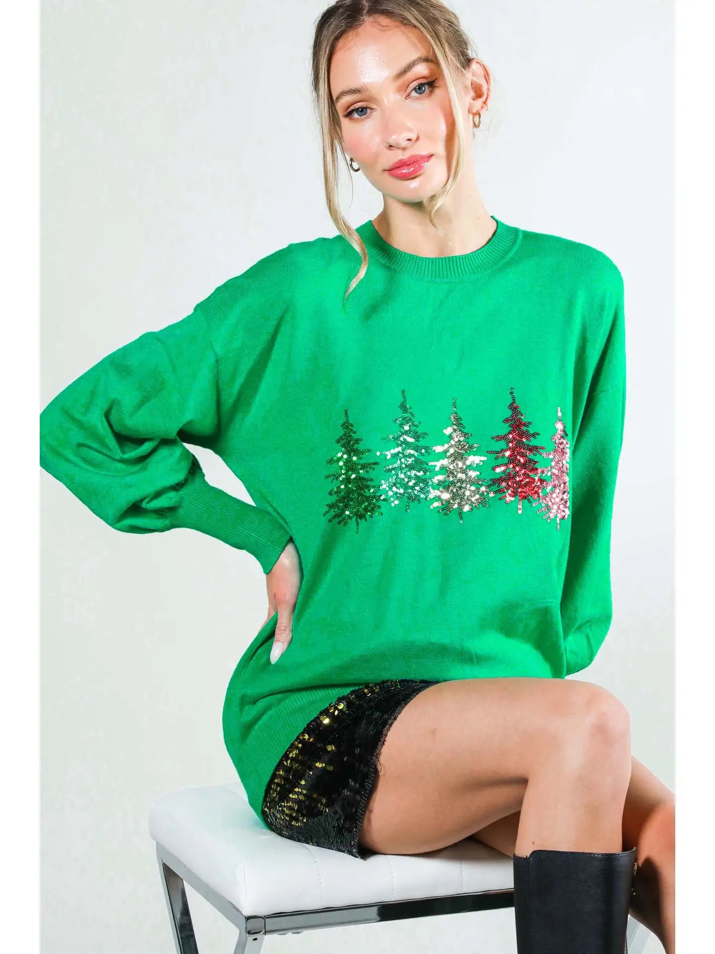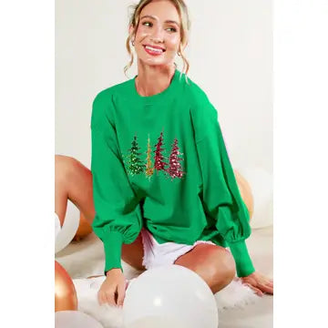 Ribbed crew neckline women's knit sweater - Casual drop shoulder - long balloon sleeve ribbed hem - Pullover style - soft touch - Five Christmas Tree embellishment sequin detail - Comfortable, relaxed fit - Lightweight and breathable for holiday and Christmas casual wear - Get ready to strut your stuff in style - Graphic tee - Holiday, Christmas, Day Party, every day, Work, Going Out...