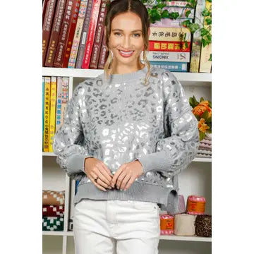 Leopard Foil Print Crew Neck Knitted Sweater Top