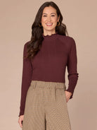 This mixed media knit top is endlessly versatile, with long sleeves, a mock neck, seaming detail, and a straight hem. Wear it on its own for an easily polished look or style it under a layer with the chic lettuce edge details popping through.
