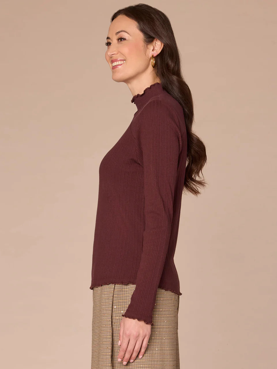Long Sleeve Mock Neck Mixed Media Knit Top with Lettuce Edge Detail