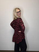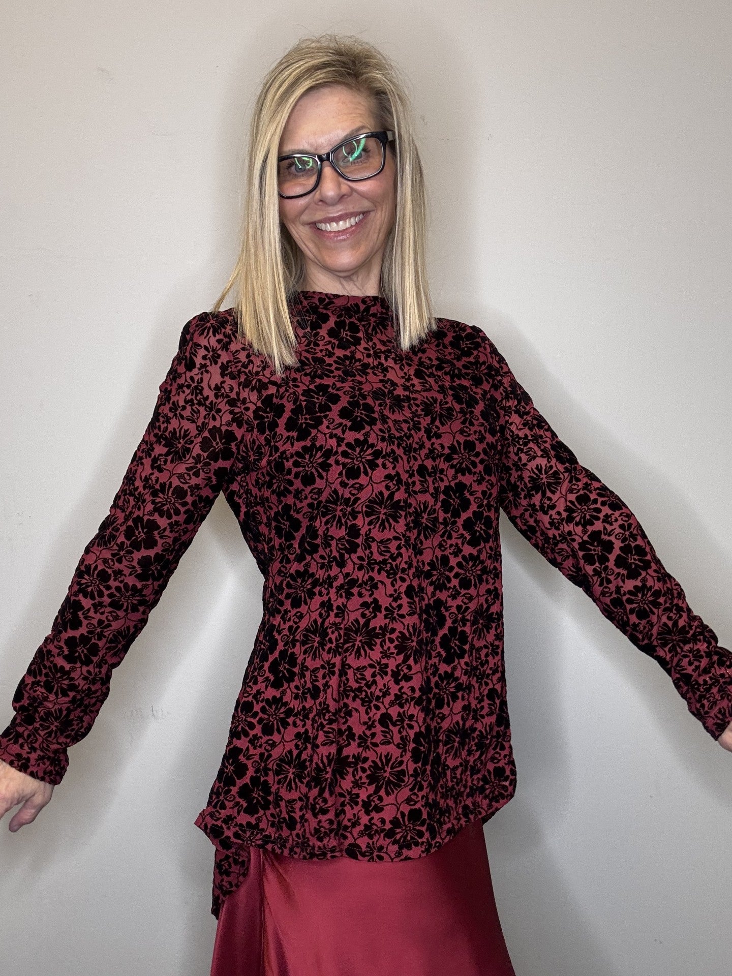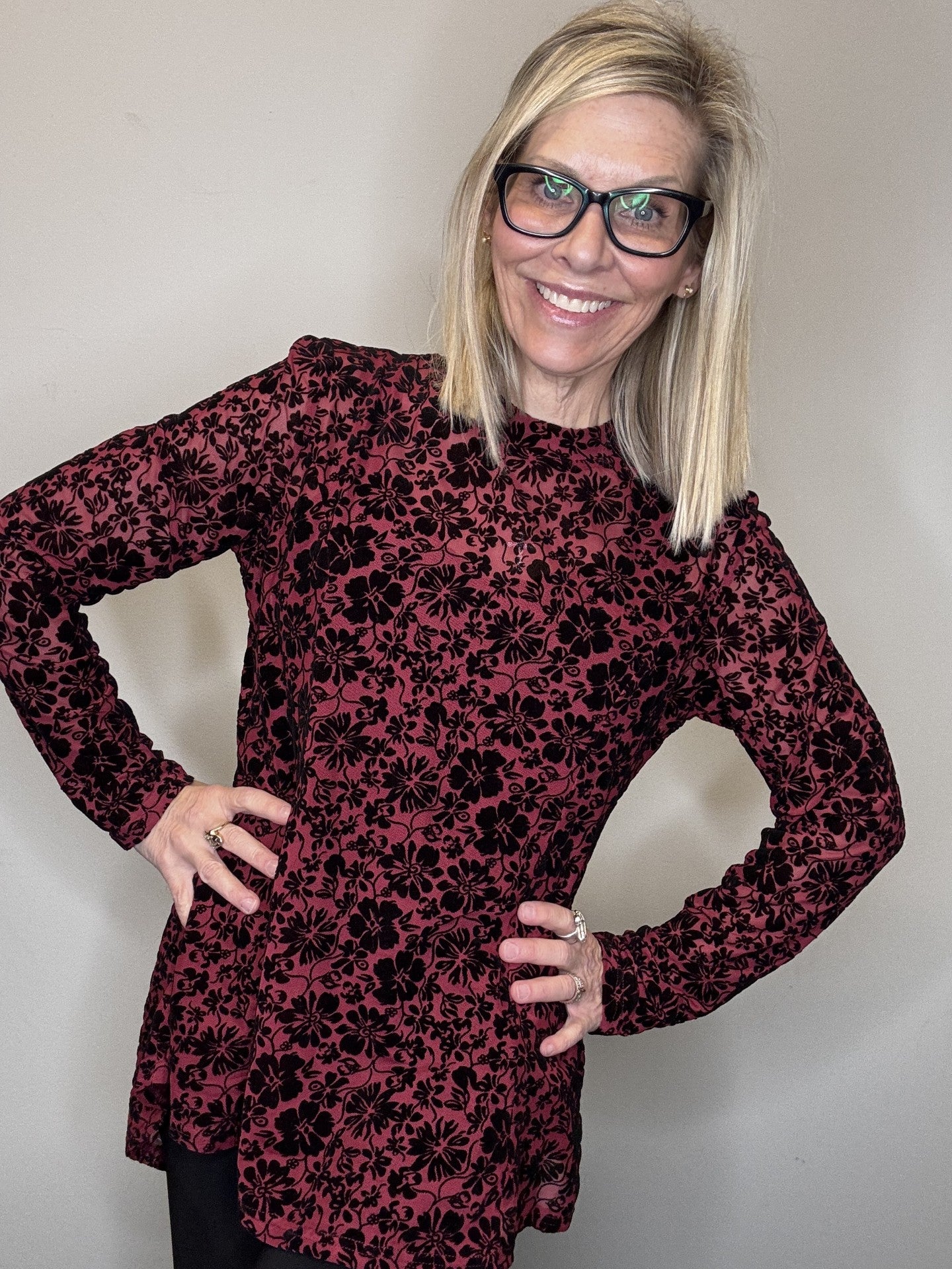 This Mock Neck Floral Burnout Peplum Top adds a flirty, fun vibe with its sheer floral pattern and playful peplum flare—perfect for twirling into any occasion!