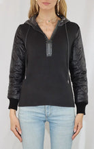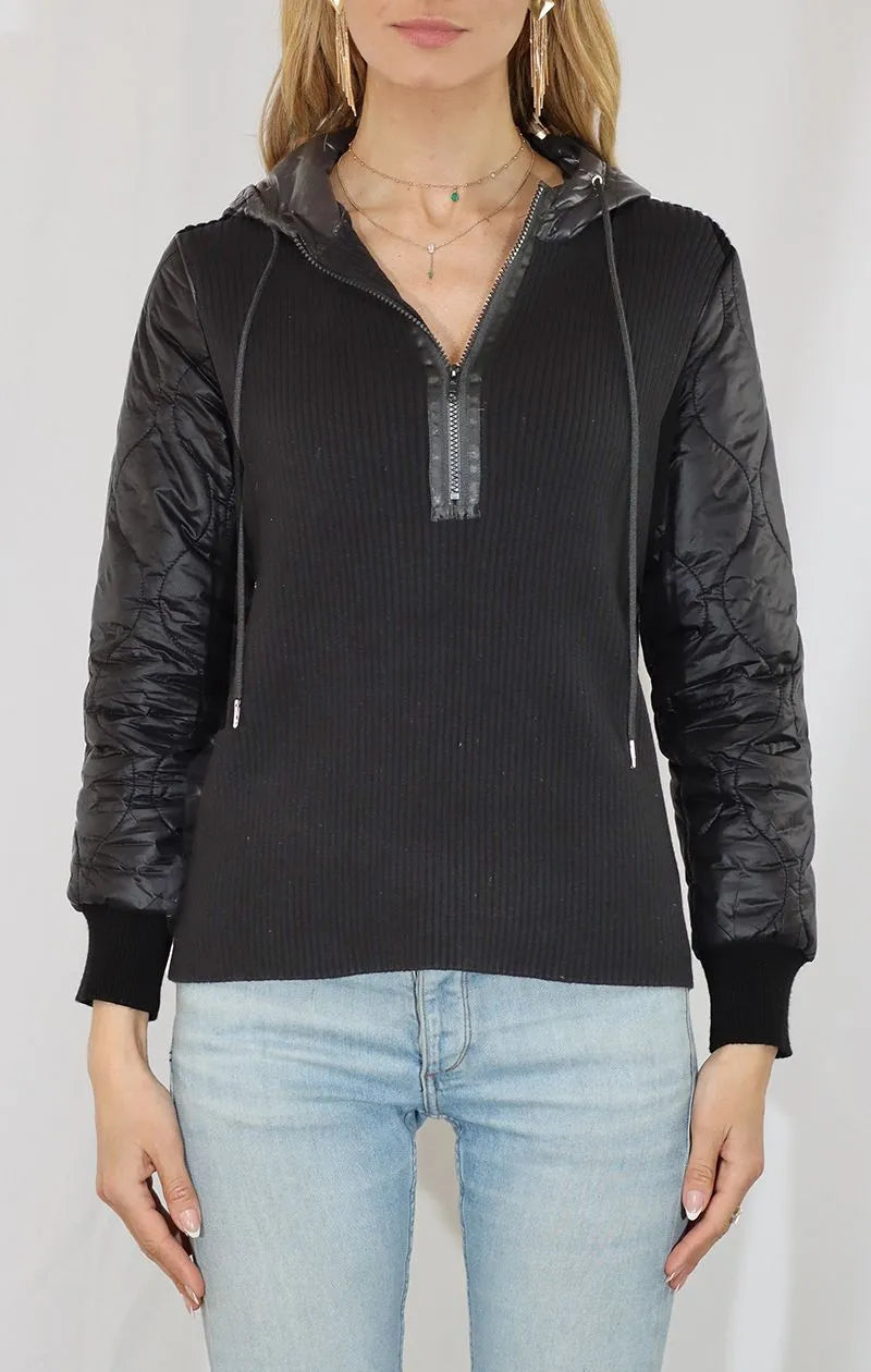 Experience comfort and style with this Rib Pullover, featuring quilted woven sleeves and a cozy hood for a fashionable, warm look.
