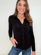 Elevate your wardrobe with the Ruched Button Front Long Sleeve from Mac and Me. Its flattering ruching detail and button-front design create a chic, tailored look, while the long sleeves add versatile coverage for any season. Perfect for dressing up or down, this piece combines comfort and style effortlessly.