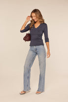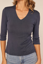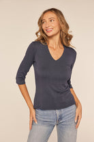 Slip into effortless style with this breezy rayon-spandex blend top. The flattering V neckline and three-quarter sleeves strike the perfect balance between casual and put-together. Pure comfort meets everyday chic.