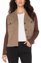 This shacket pairs a clean woven base with soft sweater-knit sleeves for a fresh play on texture. Toss it over a tee, layer it with denim, or style it with trousers for an easy-yet-elevated look—this is the layer that does all the work.