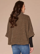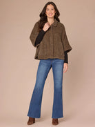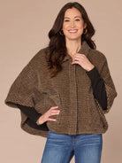 This woven capelet is so soft, you won’t want to take it off. It has a wide collar, snap front, patch pockets, and an abstract plaid design, all in a fur-like fabric.