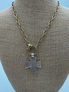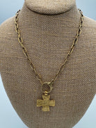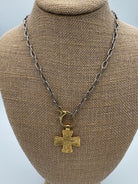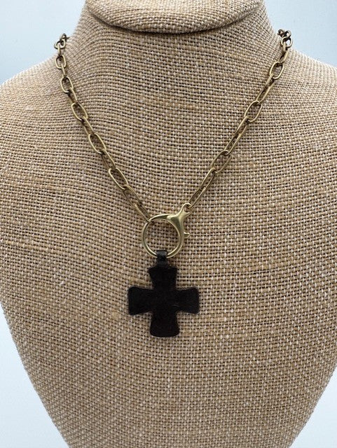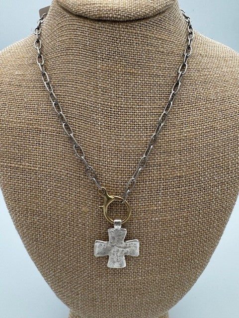 Silver, gold, or rustic brown hammered cross with antique brass front clasp, on paperclip chain. Measures 18".