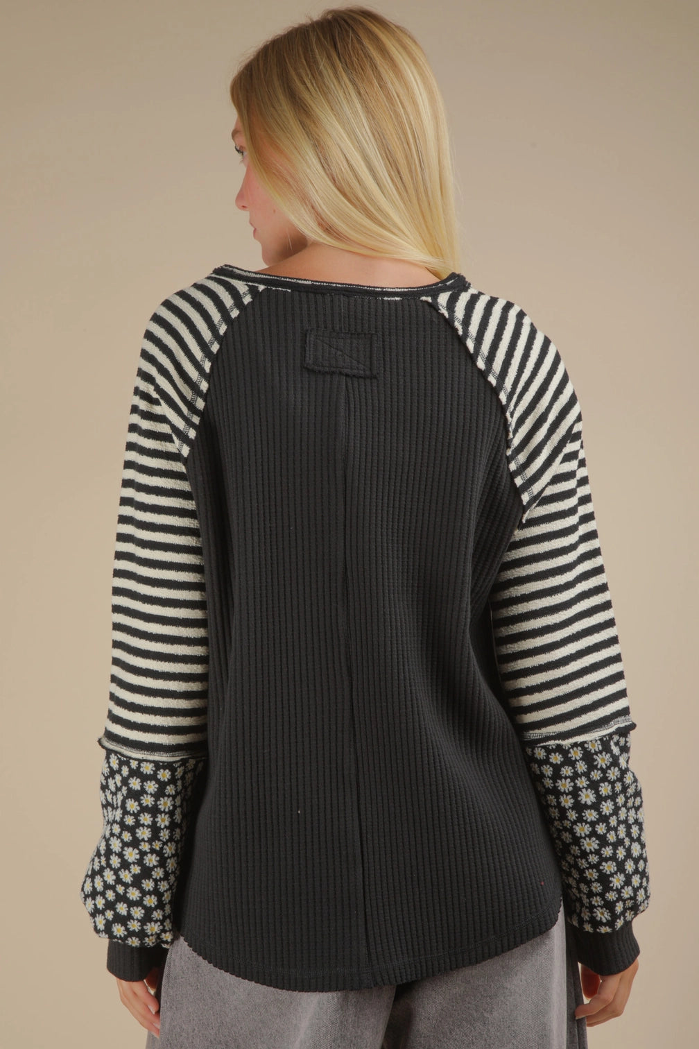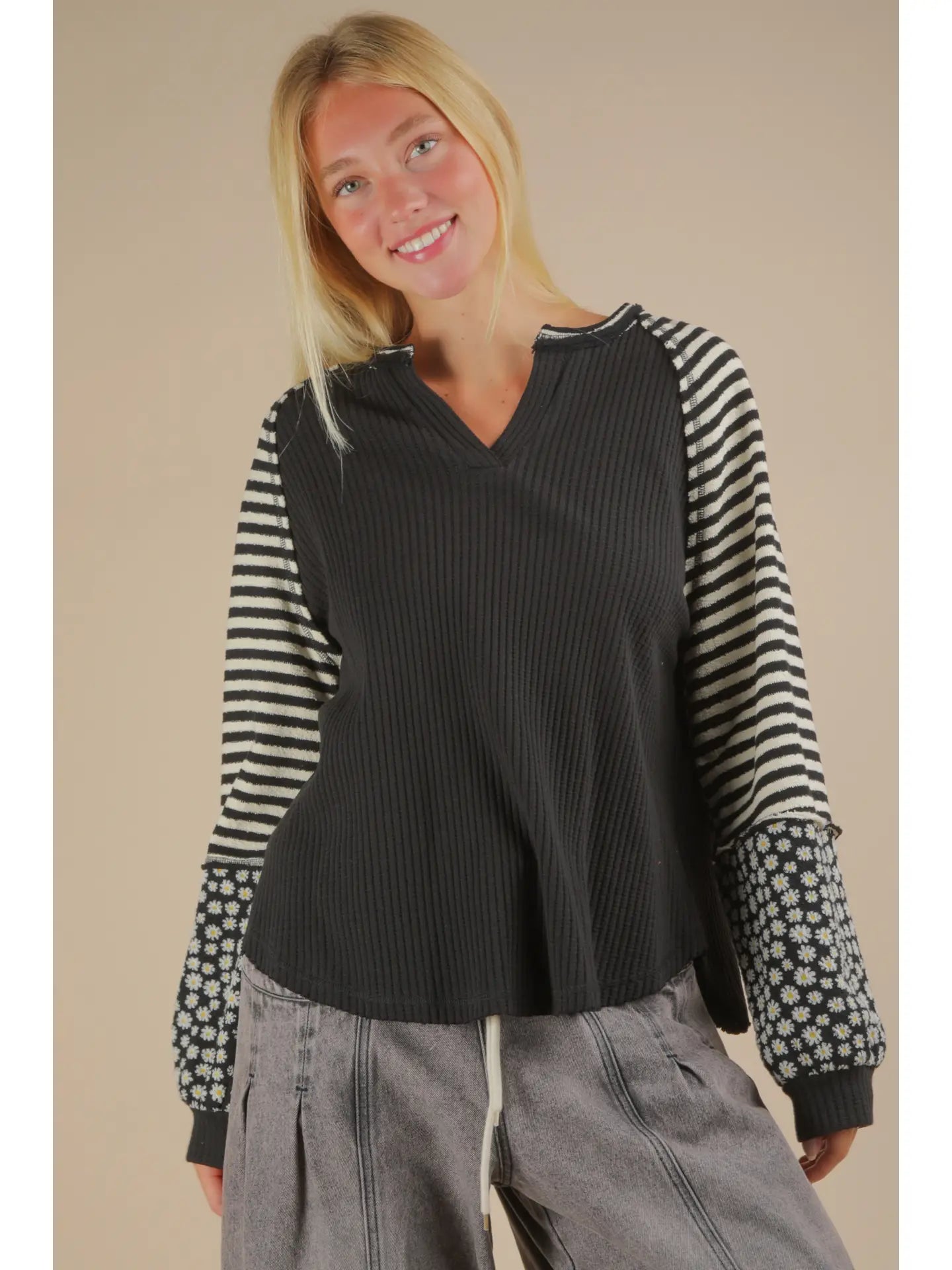 Long Tie Sleeve V-Neck Printed Woven Top with Scallop Edge Embroidery