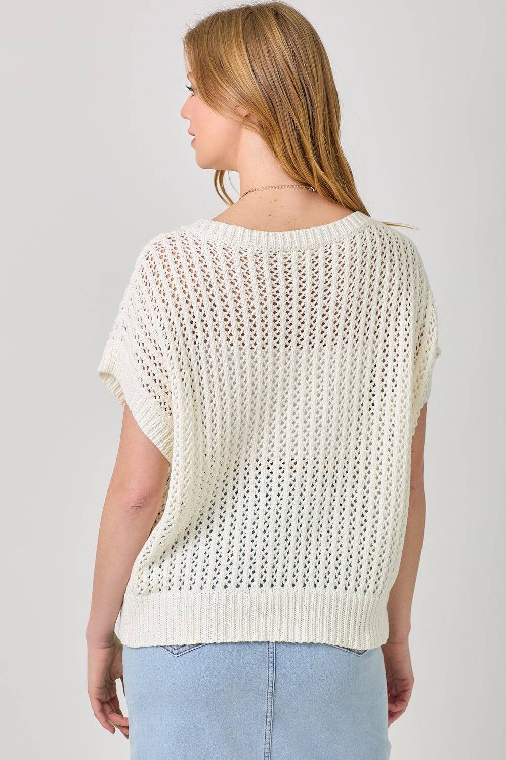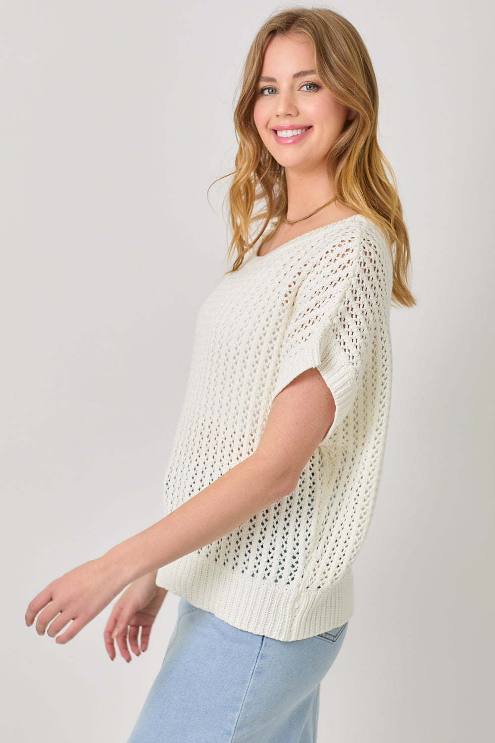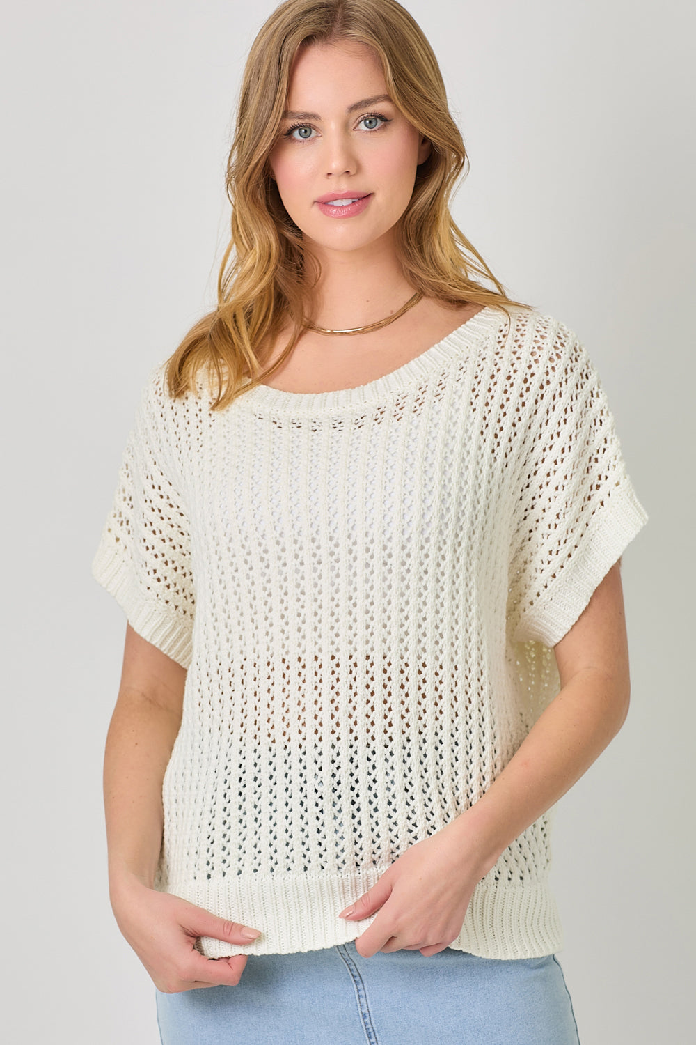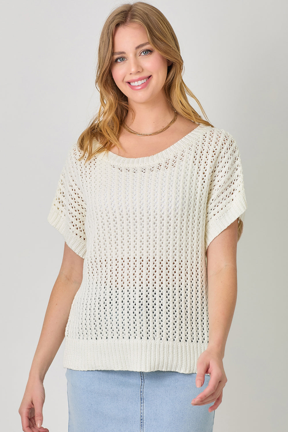 With this cozy crocheted weave slouchy pullover. Crafted in white hue, it features a relaxed, oversized fit that drapes beautifully for a casual yet chic look. The short sleeves and boat neck add to its laid-back charm, perfect for warm days or layering in cooler weather. Made from a blend it offers a soft, breathable feel with just the right amount of stretch and durability. Whether you're lounging at home, running errands, or enjoying outdoor outings, this versatile pullover combines style, comfort, and ease in one perfect piece.