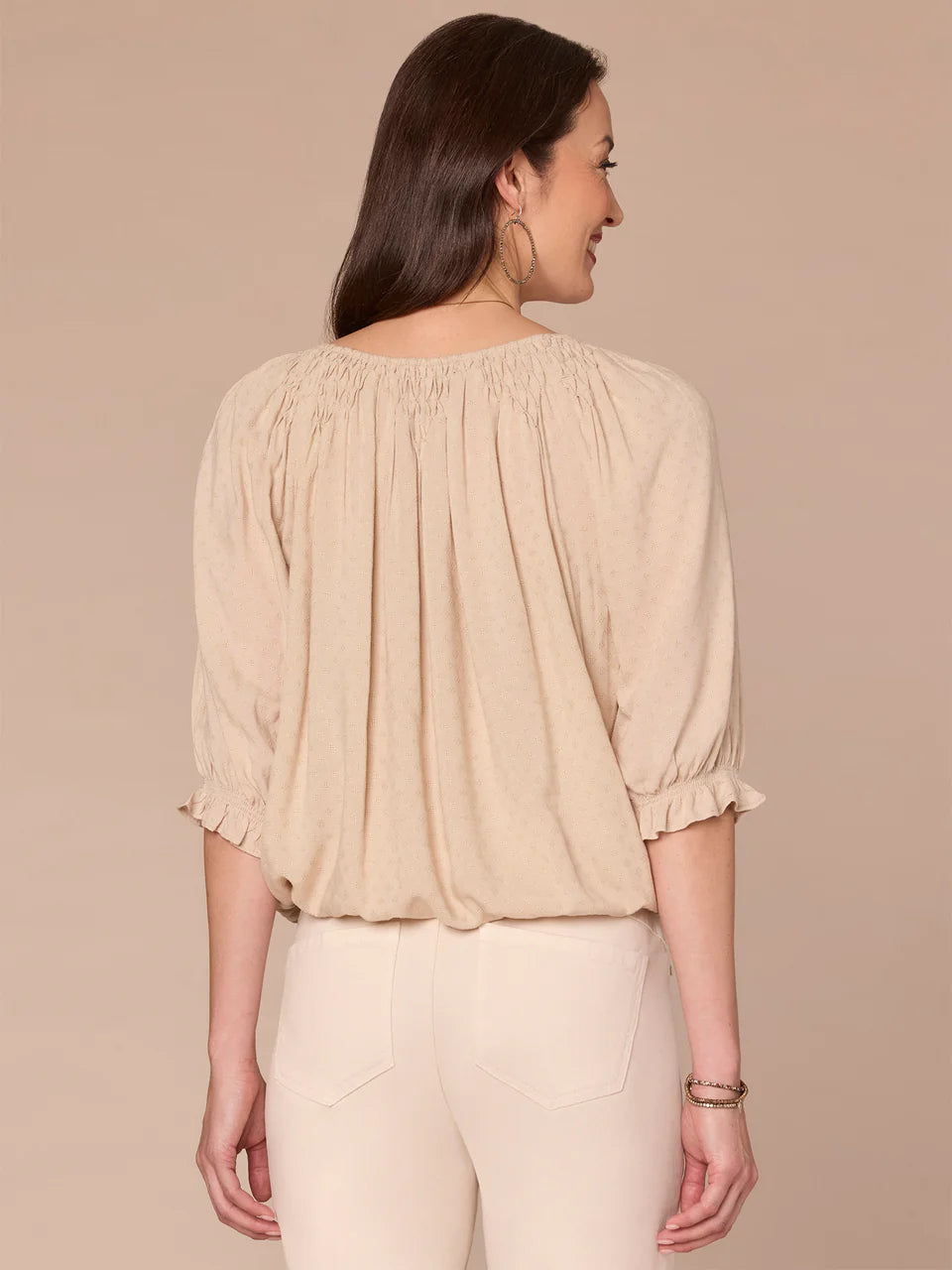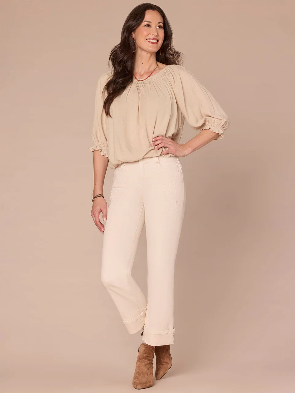When you want that tucked in look, but don’t want to add bulk, this sleek woven top’s banded bubble hem works wonders. This style has elbow length blouson sleeves, a scoop neck with honeycomb novelty smocking, and embroidery detail for a feminine finish.