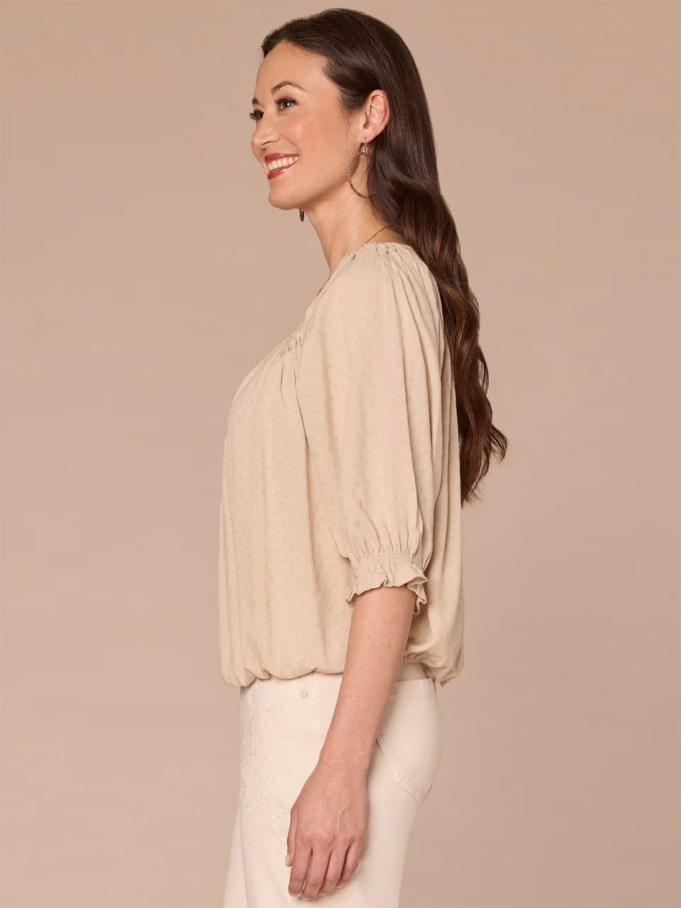 Elbow Blouson Sleeve Scoop Neck Embroidered Bubble Hem Woven Top