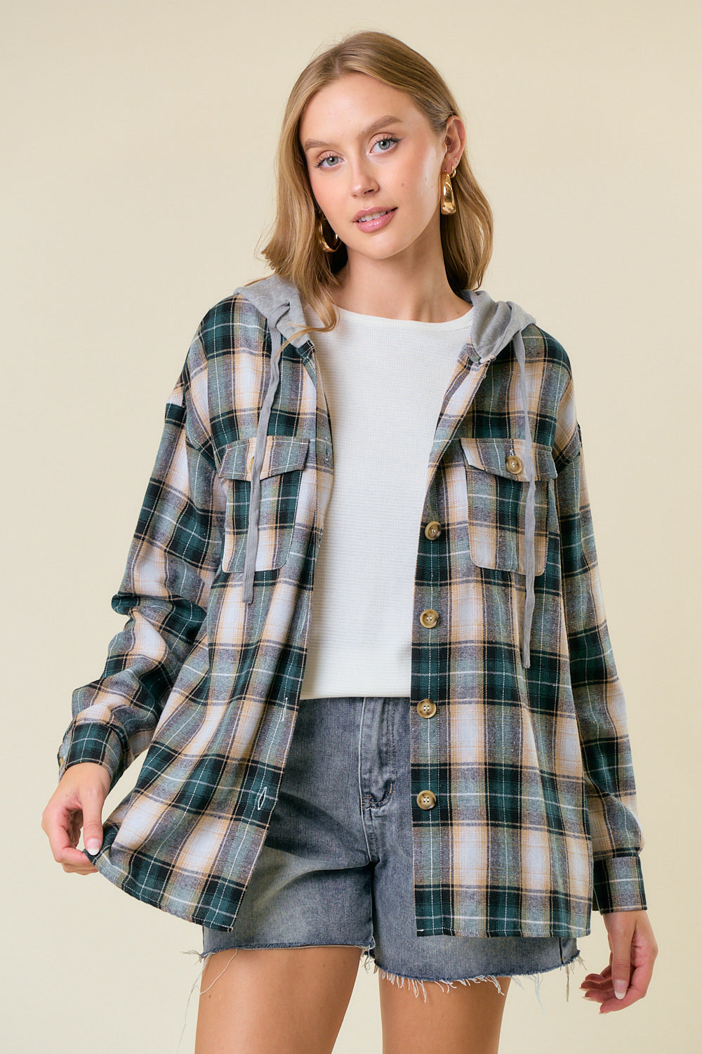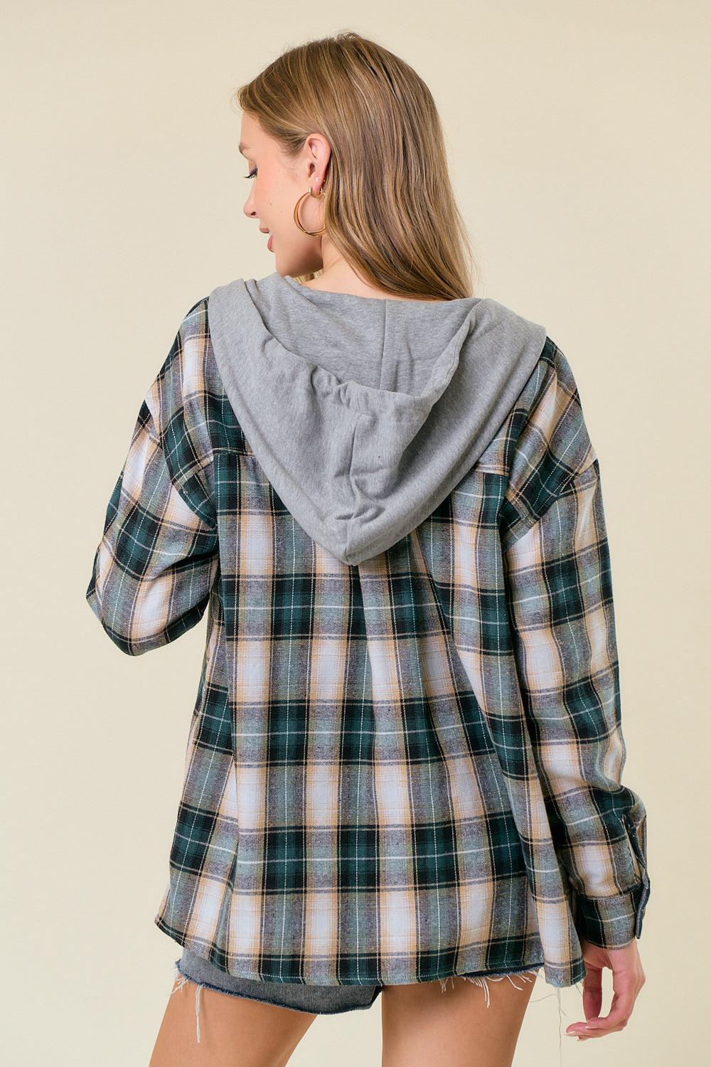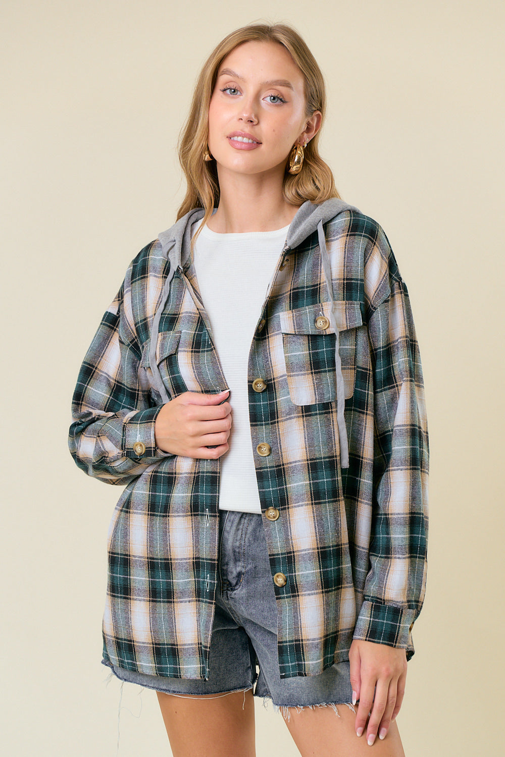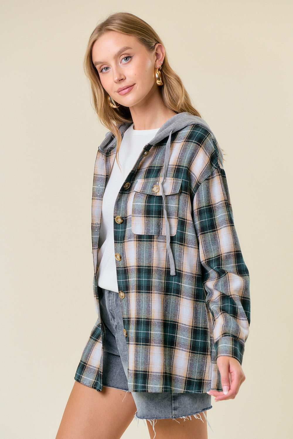 Description: HOODIED PLAID SHIRT - Oversized plaid shirt jacket with attached hood - Button-up front with large, visible buttons - long sleeves with button cuffs - Two chest pockets with button closures