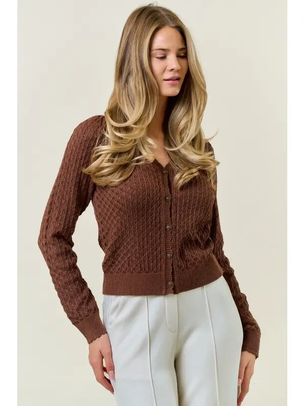 Description: POINTELLE CARDIGAN WITH ROSE BUTTONS - Delicate pointelle knit pattern for a classic, textured look - Features elegant rose-shaped buttons down the front for a feminine touch - Flattering V-neckline and ribbed trim at cuffs and hem for a polished finish - long sleeves with subtle puff at the shoulder add a hint of volume