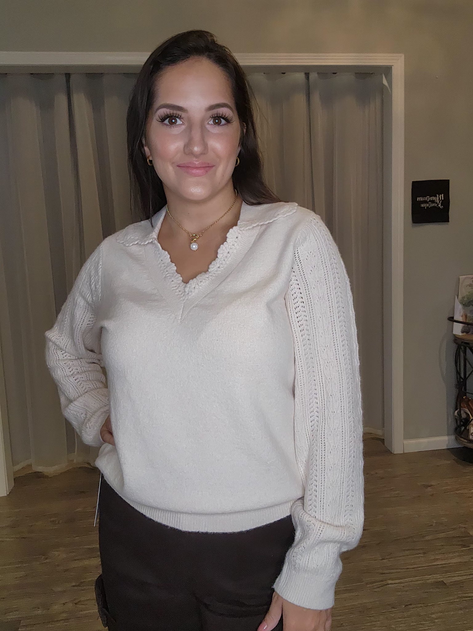 LONG SLEEVE V-NK w/COLLAR POINTELLE SWEATER