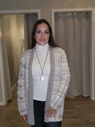 Stay cozy and stylish with this open-front fuzzy sweater cardigan. Its long sleeves and checkered pattern add warmth and timeless charm to any outfit. Perfect for layering on chilly days, this soft cardigan blends comfort with a relaxed, fashionable look that elevates your everyday wardrobe.