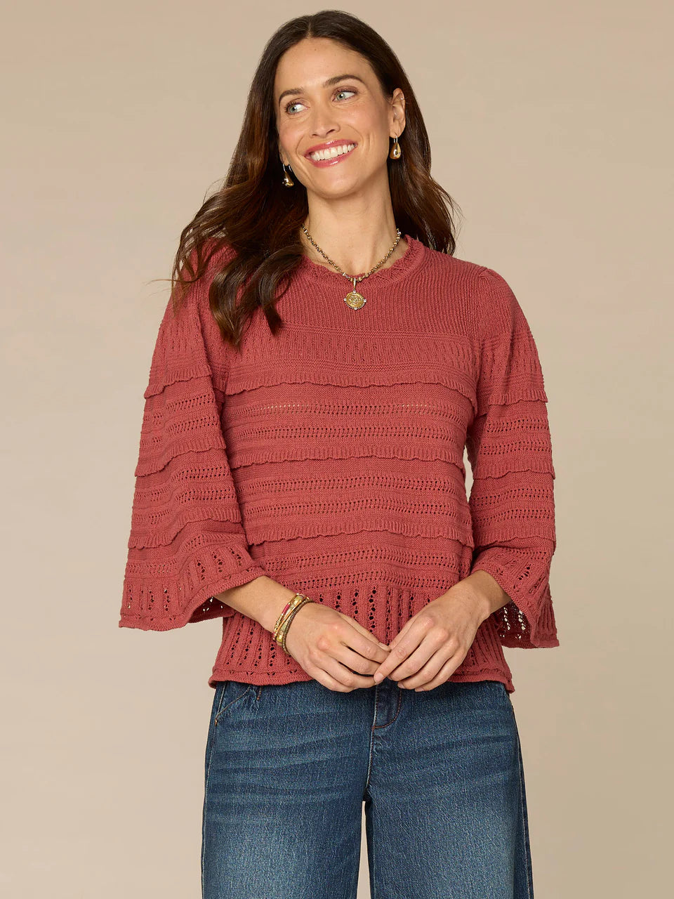 When your plans call for a little extra oomph, this variegated stitch mix sweater is a no-brainer. It’s designed with three quarter bell sleeves, a round scallop neck, and a scallop hem, and it’s available in two on-trend hues.