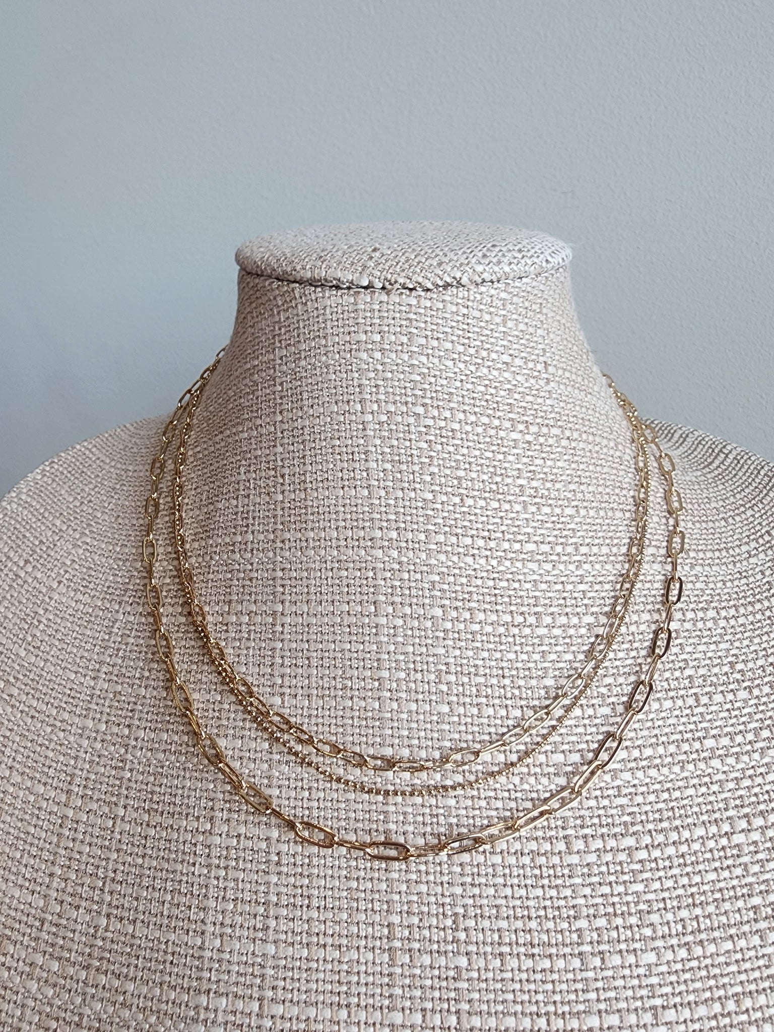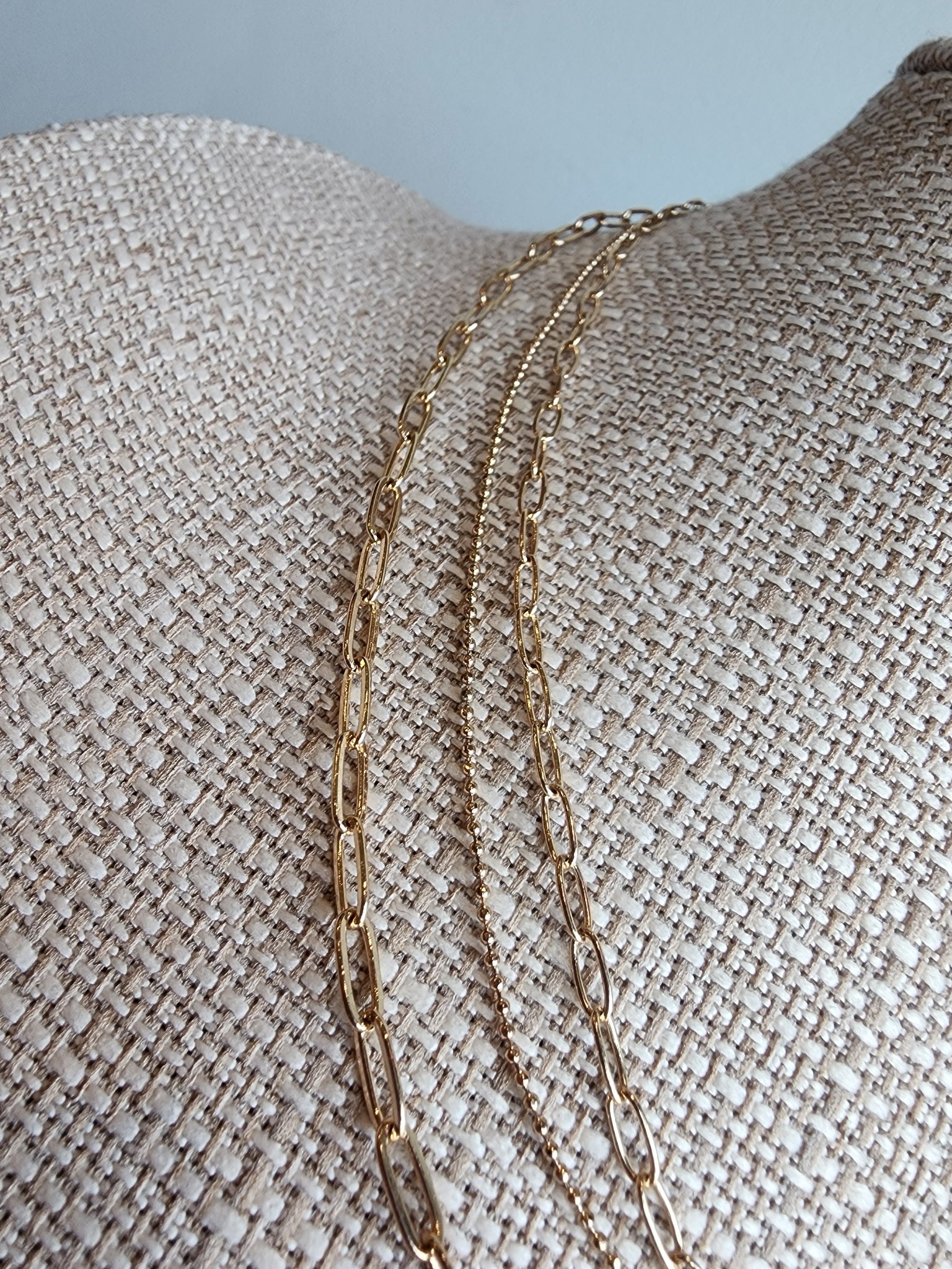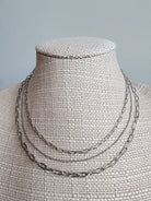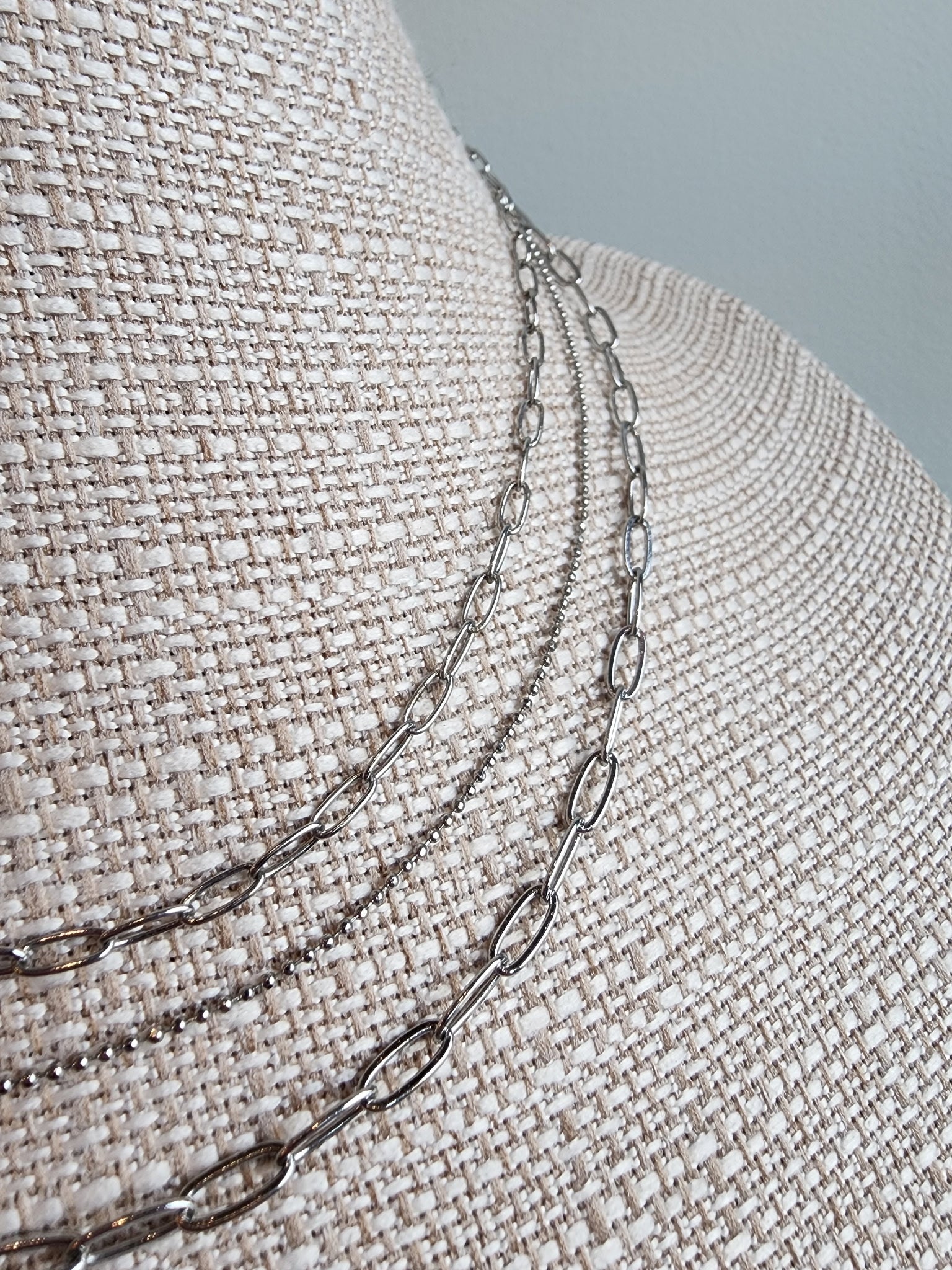 Rock an edgy vibe with this triple chain asymmetrical necklace. Uneven chains deliver modern attitude that pairs perfectly solo or layered. Bold, statement-making, and totally you.