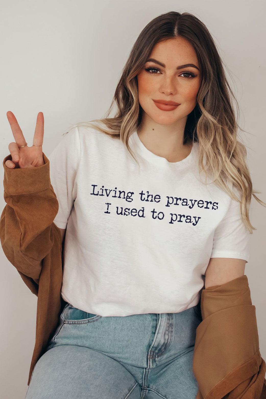 This white cotton tee with black writing is perfect for those who want to add a touch of positivity to their wardrobe. The eye-catching font brings a fun element to the phrase "living the prayers I use to pray," reminding us to embrace the present and appreciate the blessings in our lives. Comfortable and stylish, this tee is a must-have for any spiritual individual.