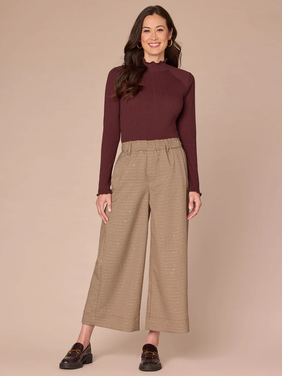Long Sleeve Mock Neck Mixed Media Knit Top with Lettuce Edge Detail