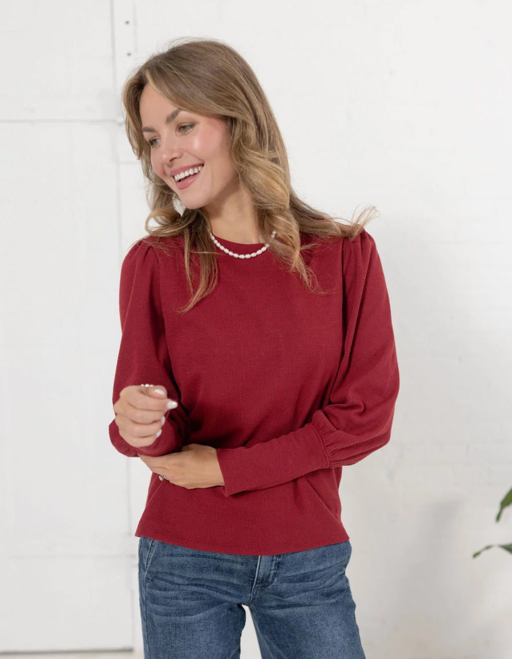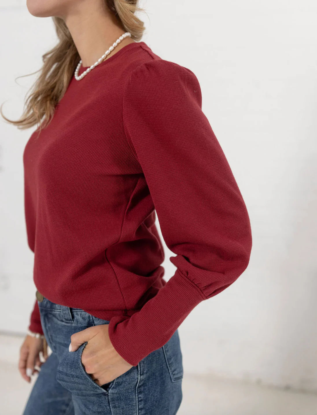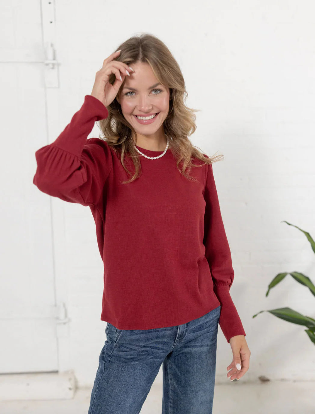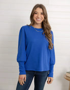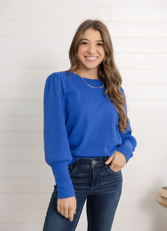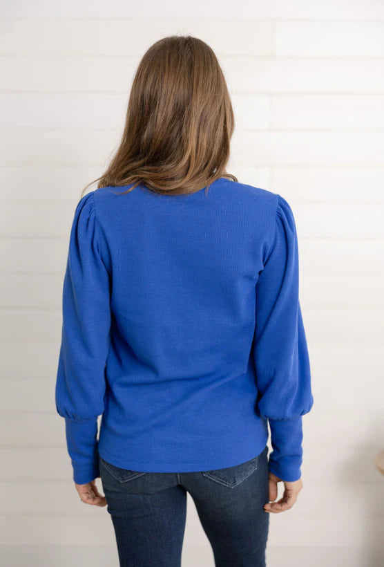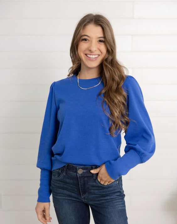 Feminine and flattering, the Mac and Me Gathered Shoulder Top is your new go-to for elevated everyday style. Crafted in a lightweight mini waffle knit, it features gently gathered shoulders and puffed sleeves with extra-long cuffs for a chic, modern finish. The classic crew neckline keeps it versatile, while the soft stretch makes it perfect for all-day wear.