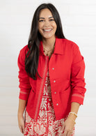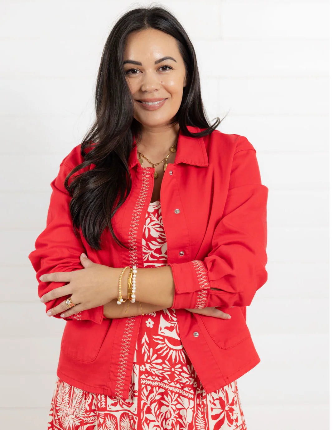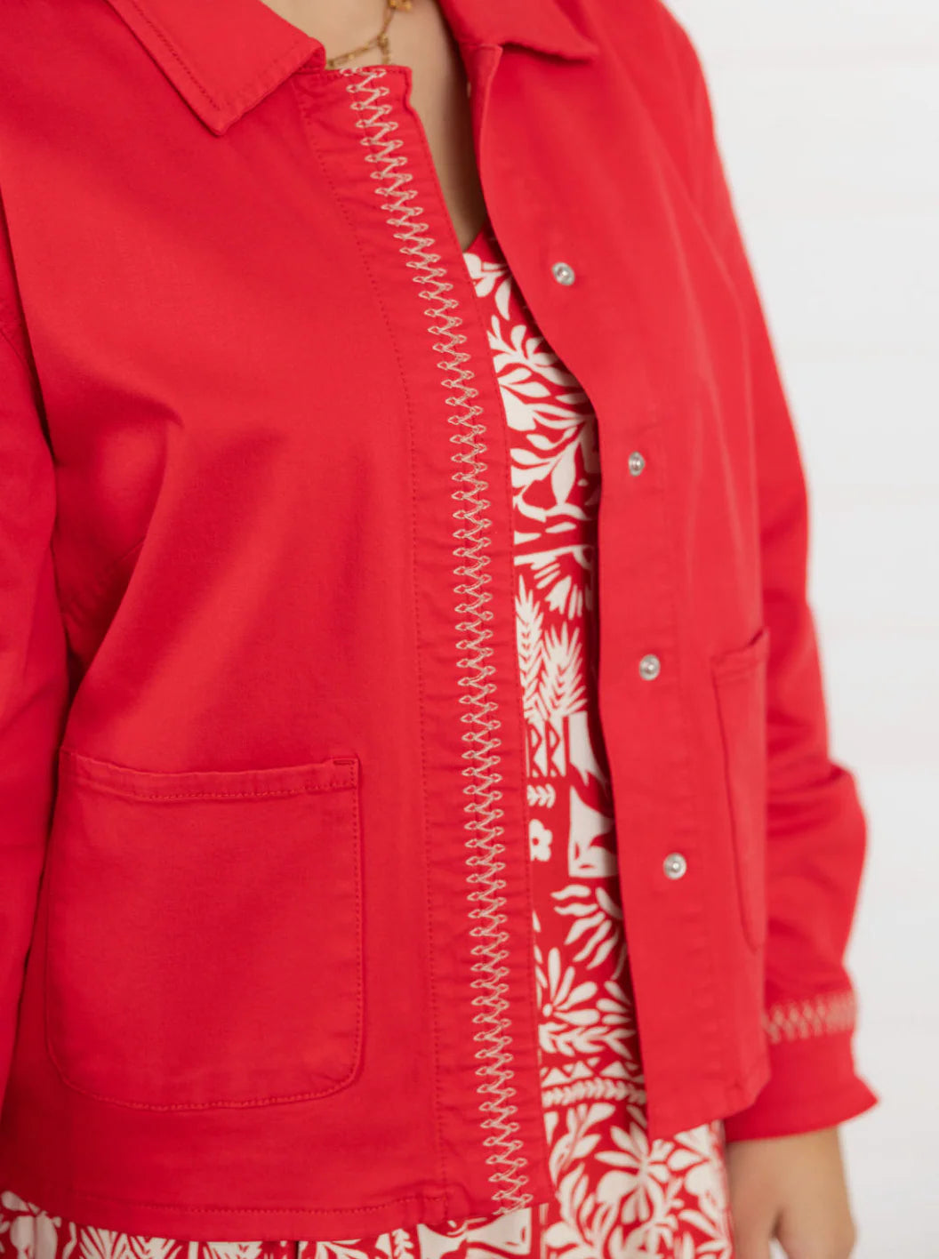 TheĀ MB Embroidered Placket JacketĀ from our privateĀ MBĀ line is your elevated take on the classic denim jacket. Crafted from soft stretch comfort denim, it moves with you while keeping a structured, put-together feel. A point collar and snap-front closure give it a clean, refined look, while contrast zigzag stitching and front patch pockets add just the right amount of standout detail.