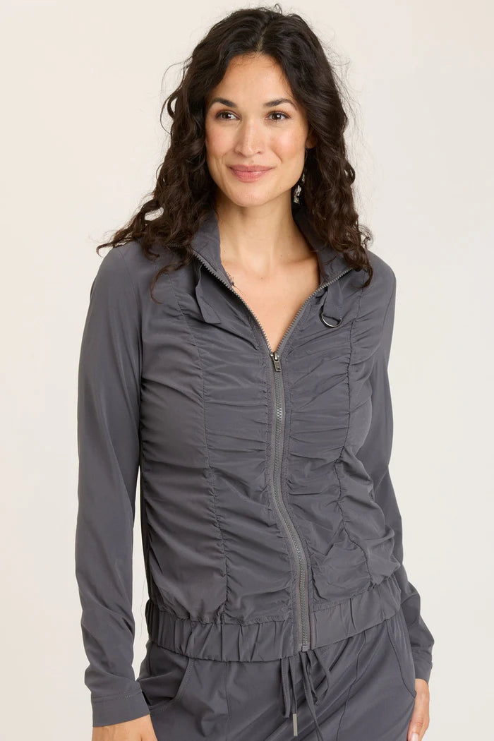 Maximum performance meets the Momentum Jacket in flexible Whisper 4-Way Stretch fabric, designed for sweat-resistant movement and easy comfort. Momentum features allover ruching on the front, an elastic cinched hemline, and a belted buckle detail at the collar for some added chic. Wear for movement or style with a casual bottom for sartorial excellence! Activewear never looks so stylish!