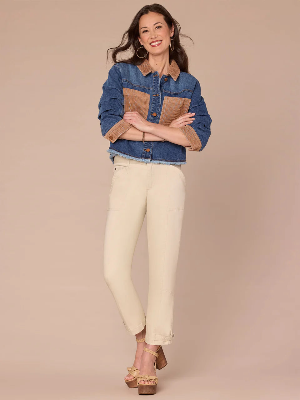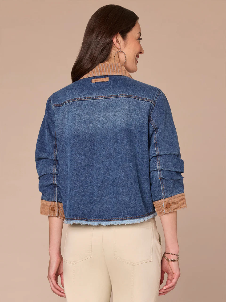 Ruched Sleeve Button Front Mixed Media Denim Jacket with Fray Hem