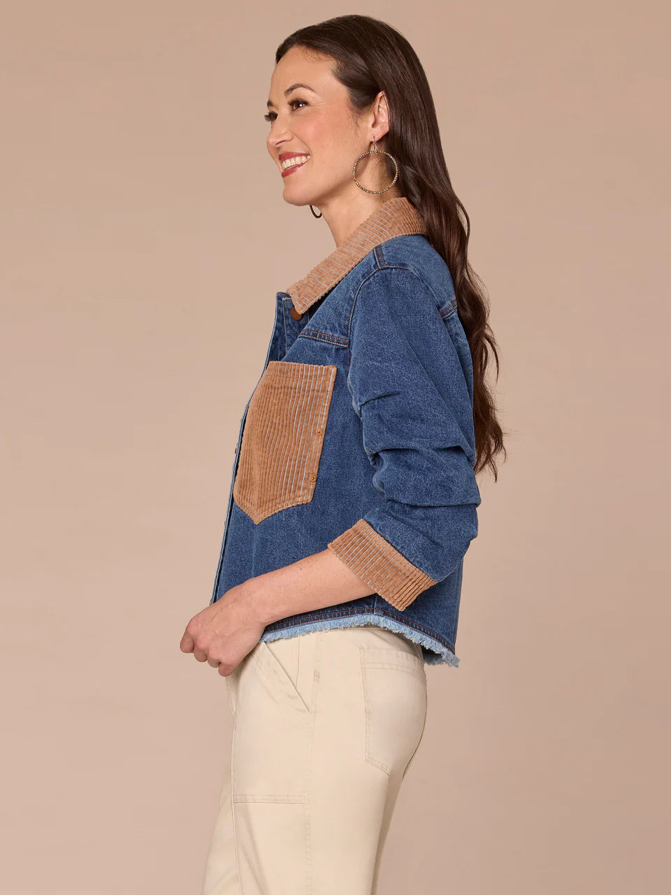 The perfect combination between stylish and comfy, this mixed media denim jacket has all the details you’re looking for. It has three quarter ruched sleeves, a collar neck, button front, oversize pockets, and a curved fray hem.