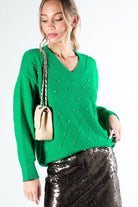 V-Neck Rhinestone Accent Argyle Knitted Sweater Top VT81546-