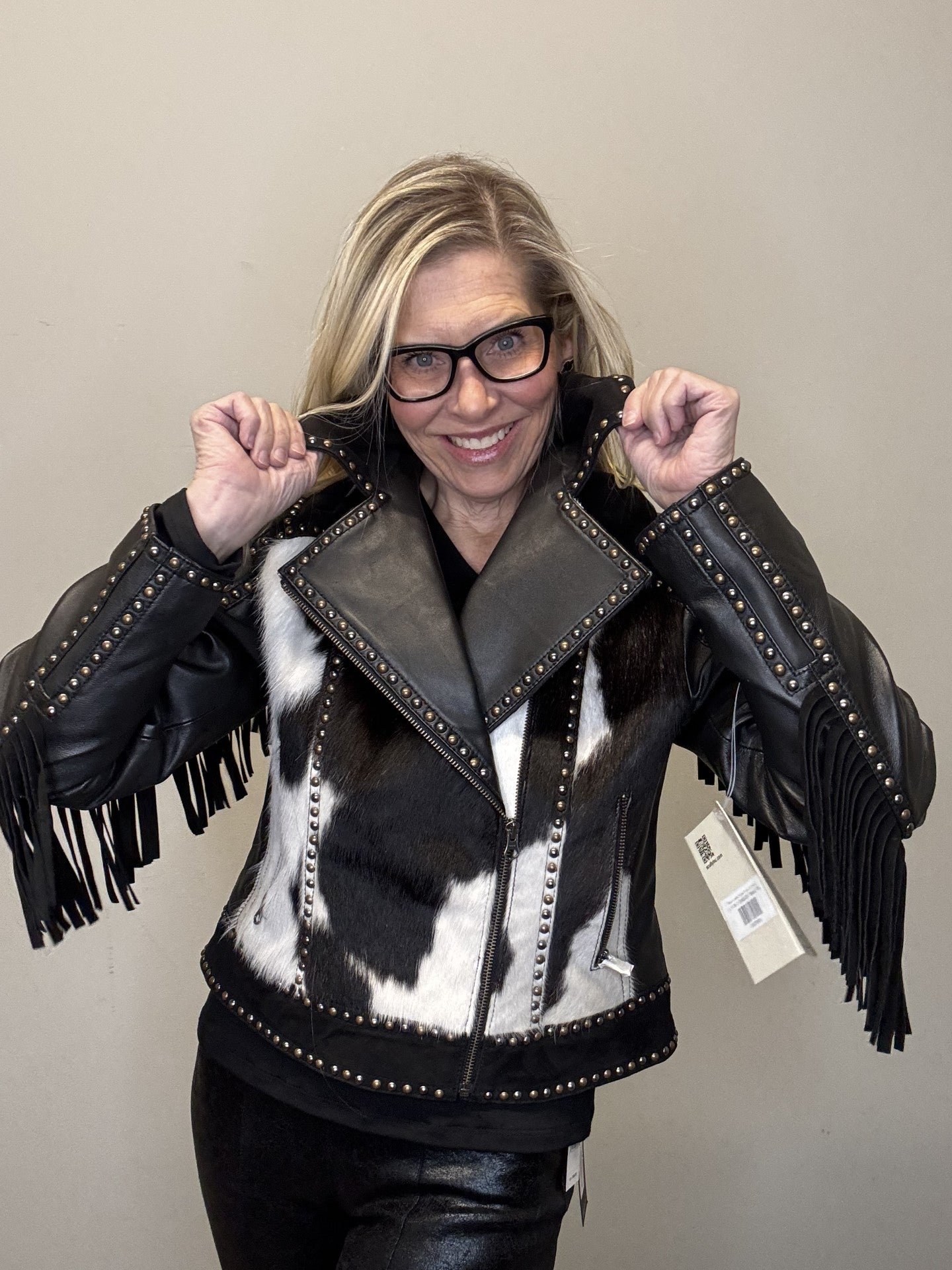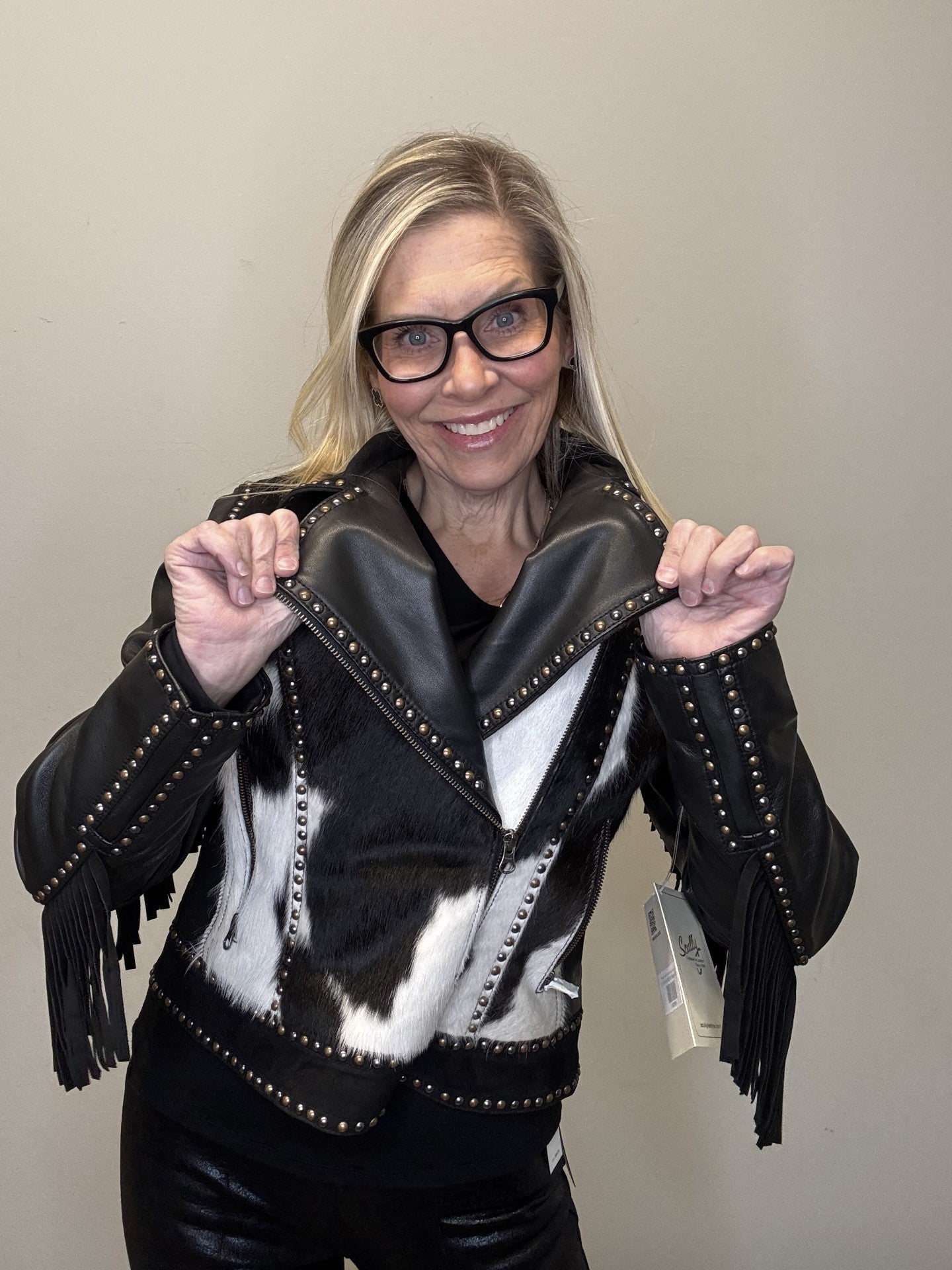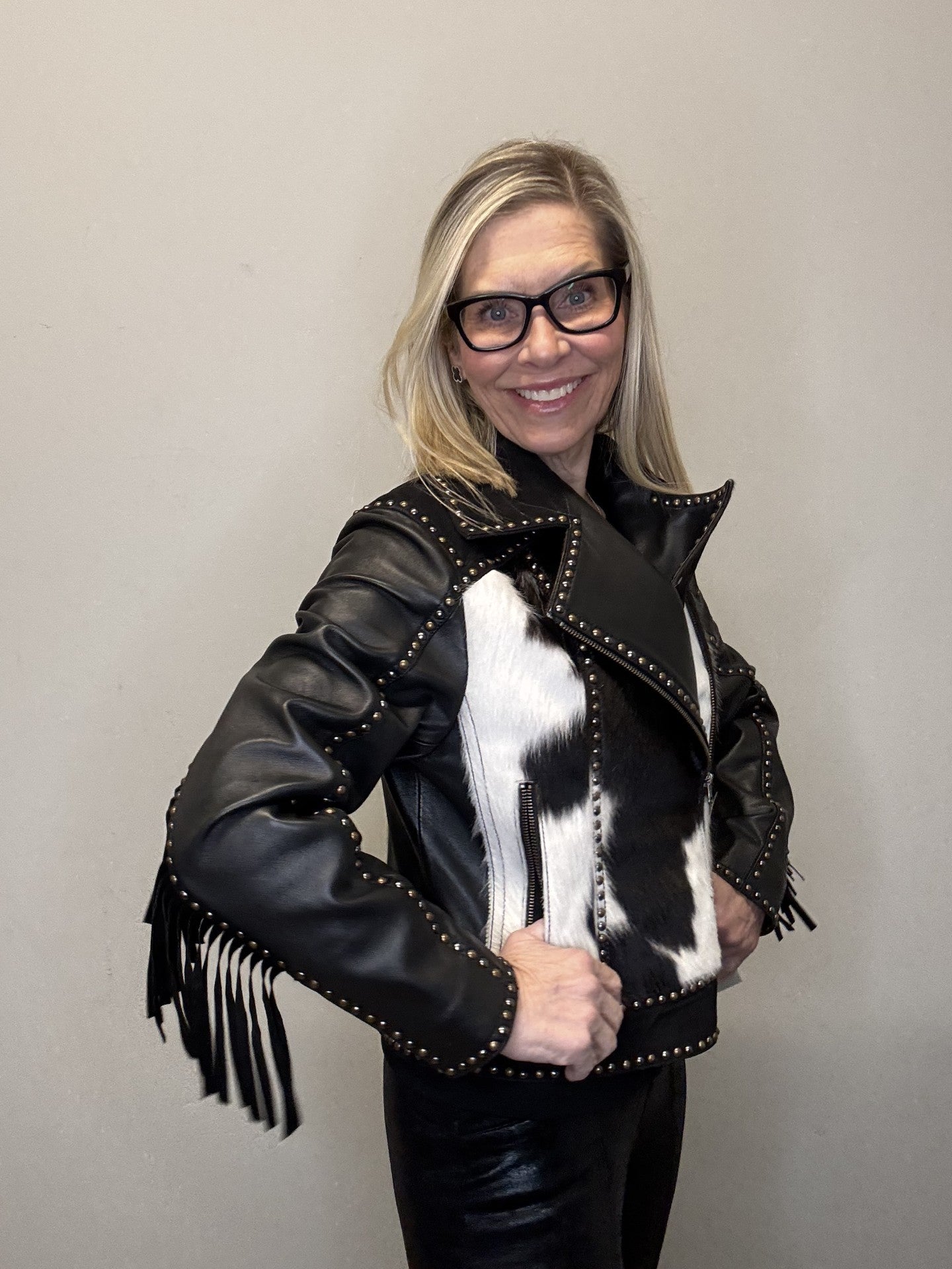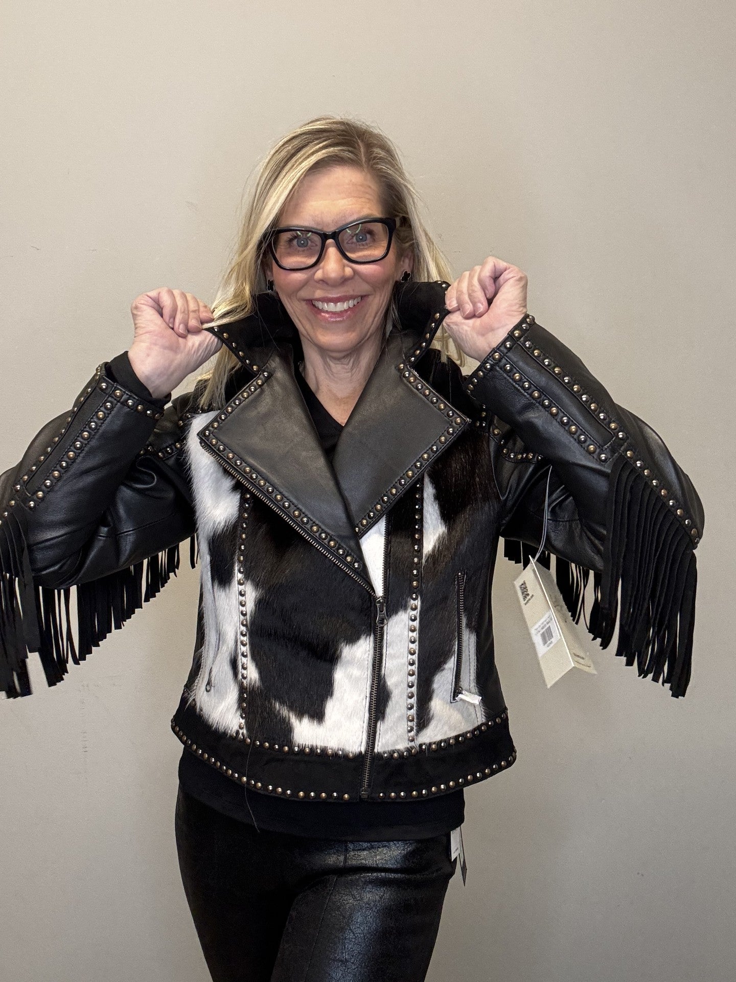 • Western inspired leather with cowhide jacket.